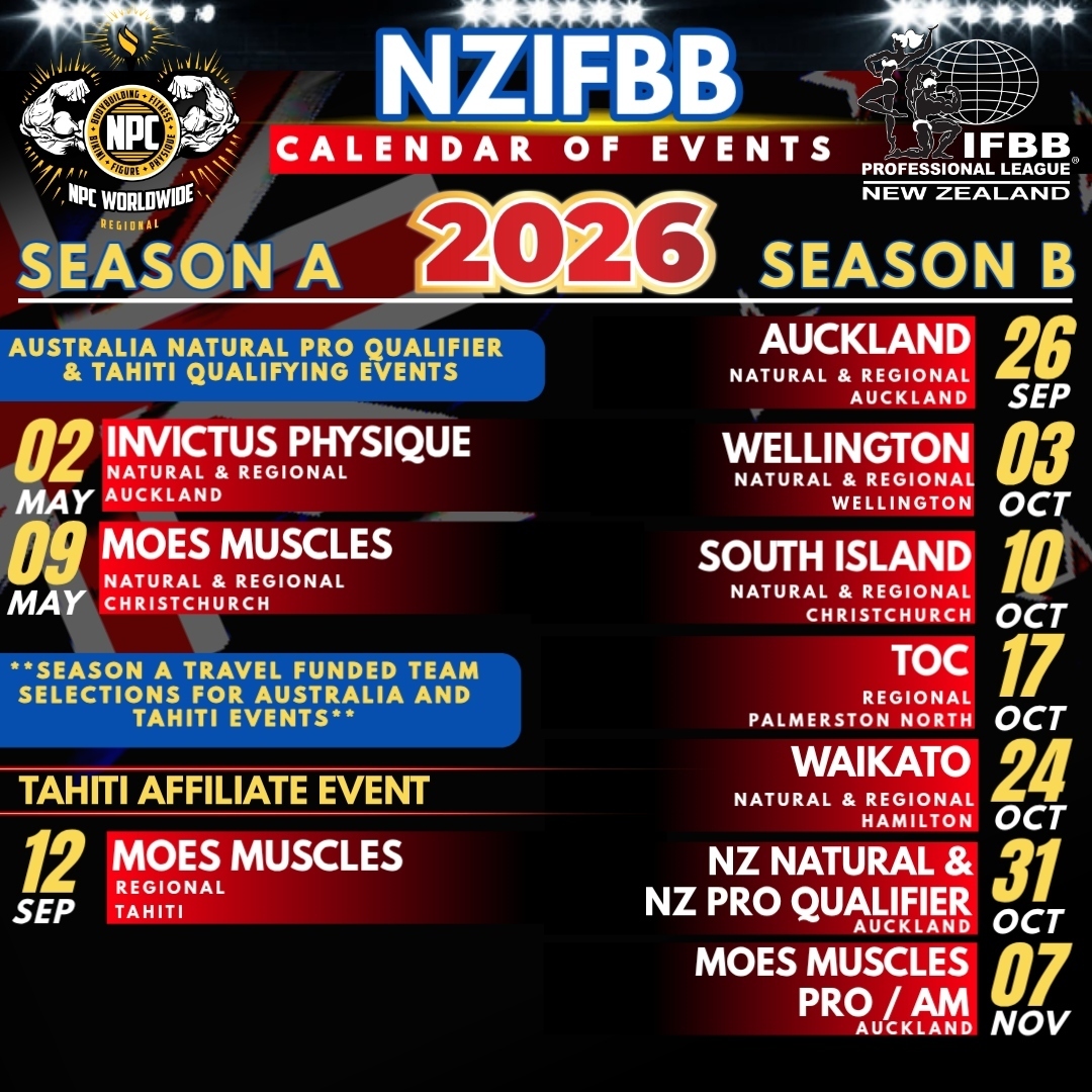 The IFBB PRO LEAGUE NZ has been established in New Zealand and is affiliated to the IFBB PRO LEAGUE and NPC Worldwide . The IFBB PRO LEAGUE NZ is a federation dedicated to supporting bodybuilding and fitness in New Zealand whilst promoting a healthy enjoyable lifestyle for all. The purpose of the IFBB PRO LEAGUE NZ is to provide competitions for New Zealand bodybuilders which enable them to be granted IFBB PRO Status and compete against other PRO bodybuilding athletes around the world. QUALIFY to the Mr. Olympia, the Arnold Classic and many more amazing IFBB PRO Events! Join us today!